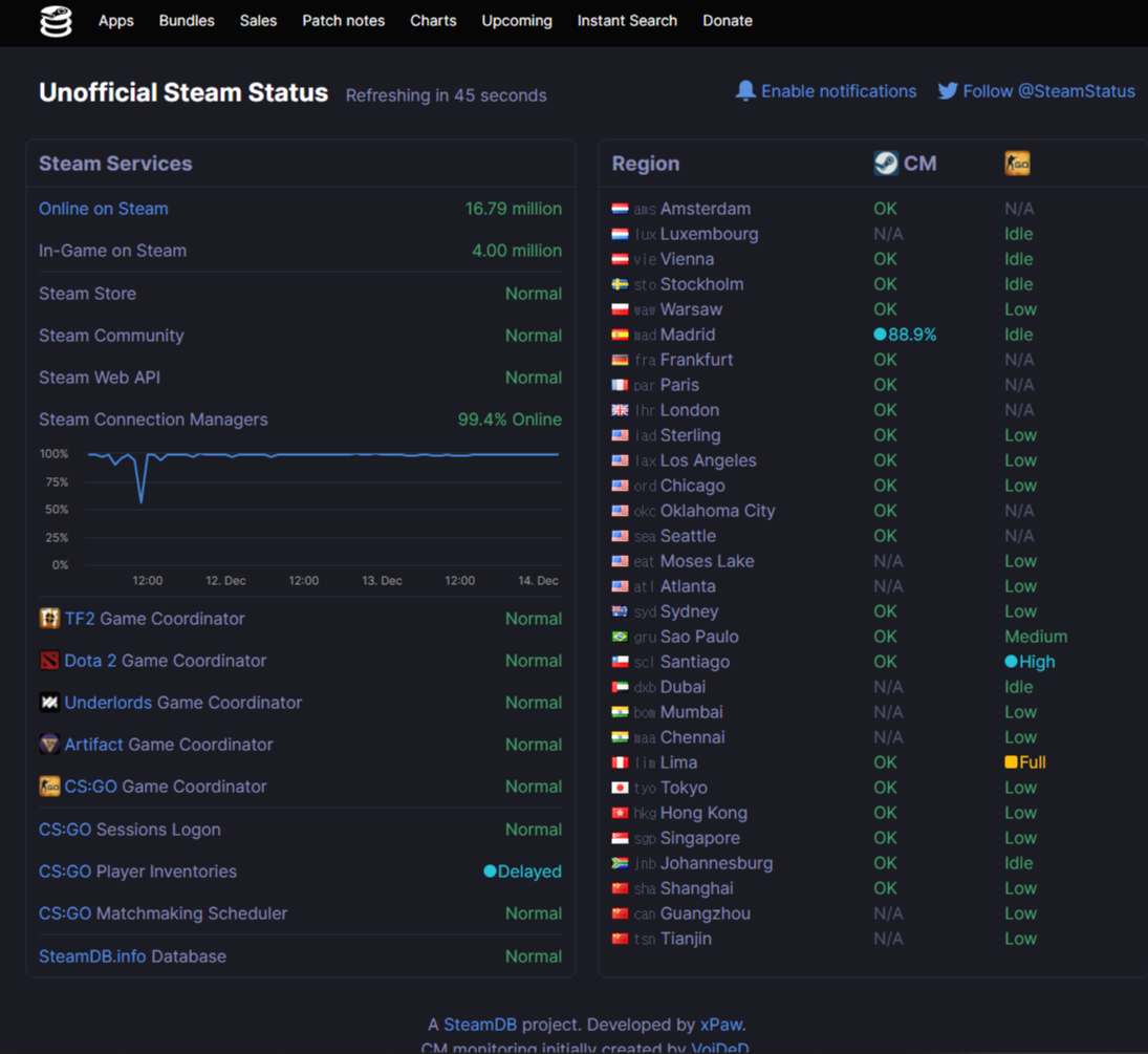 Displays status of Steam client, Steam store, Steam community, Dota 2, TF2 and CSGO